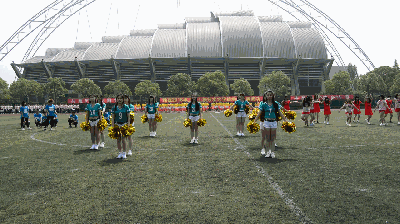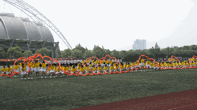最后登场的是由体育部聂焱鑫等老师编排的大型团体操表演《展翅工程、礼赞奥运》,五百多名女生衣着鲜艳、活力迸发地出现在绿茵场上,转身、跳跃、变造型,将开幕式的气氛推向高潮。