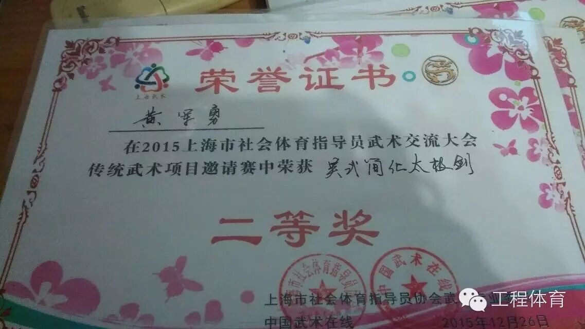 获得“上海市武术交流大会-吴氏太极拳一等奖”和“麒麟鞭二等奖”