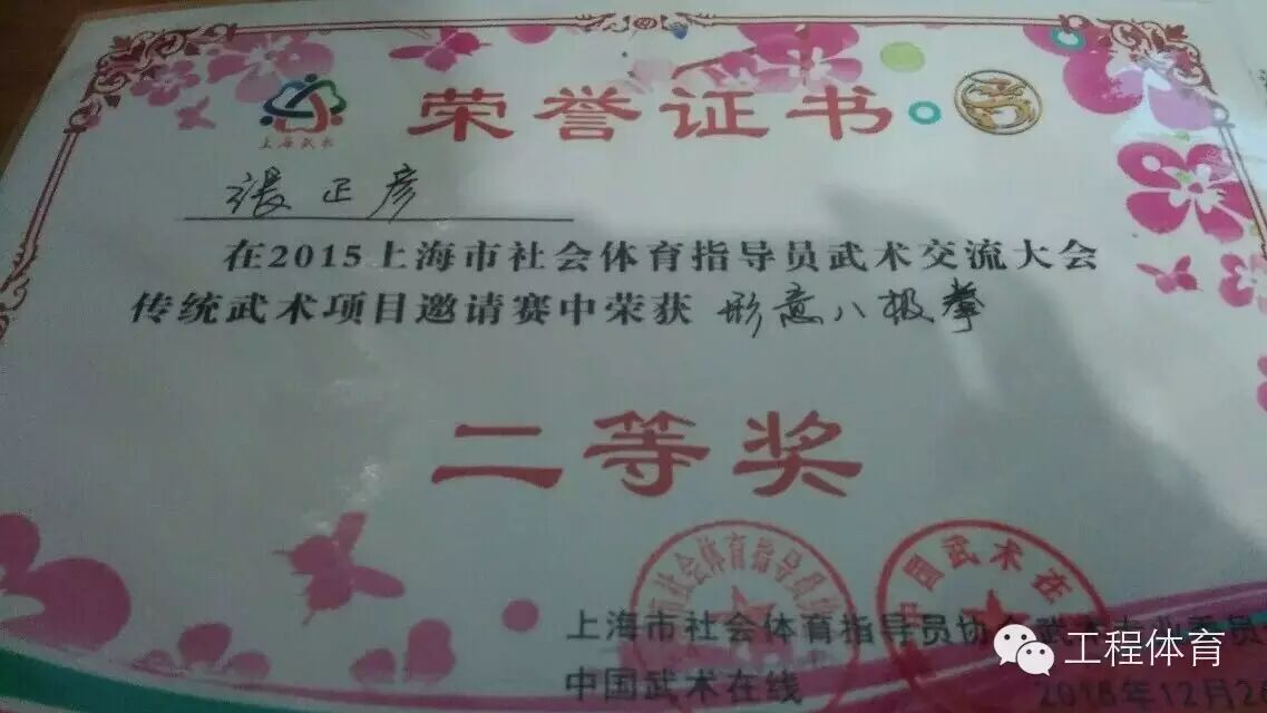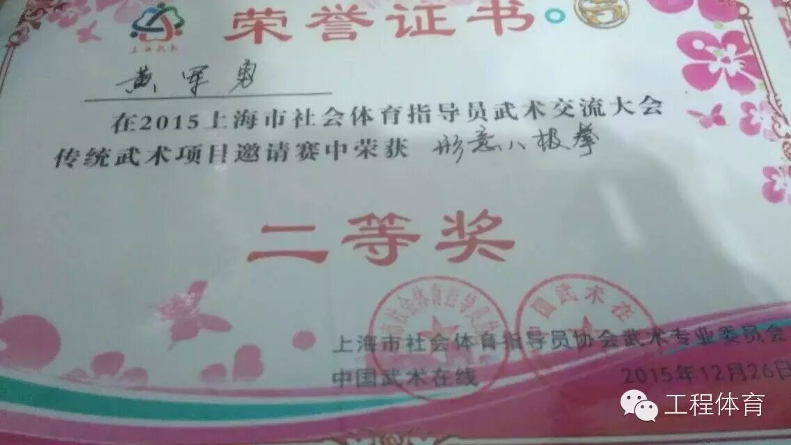 获得“上海市武术交流大会-形意八极拳二等奖”和“太极剑二等奖”